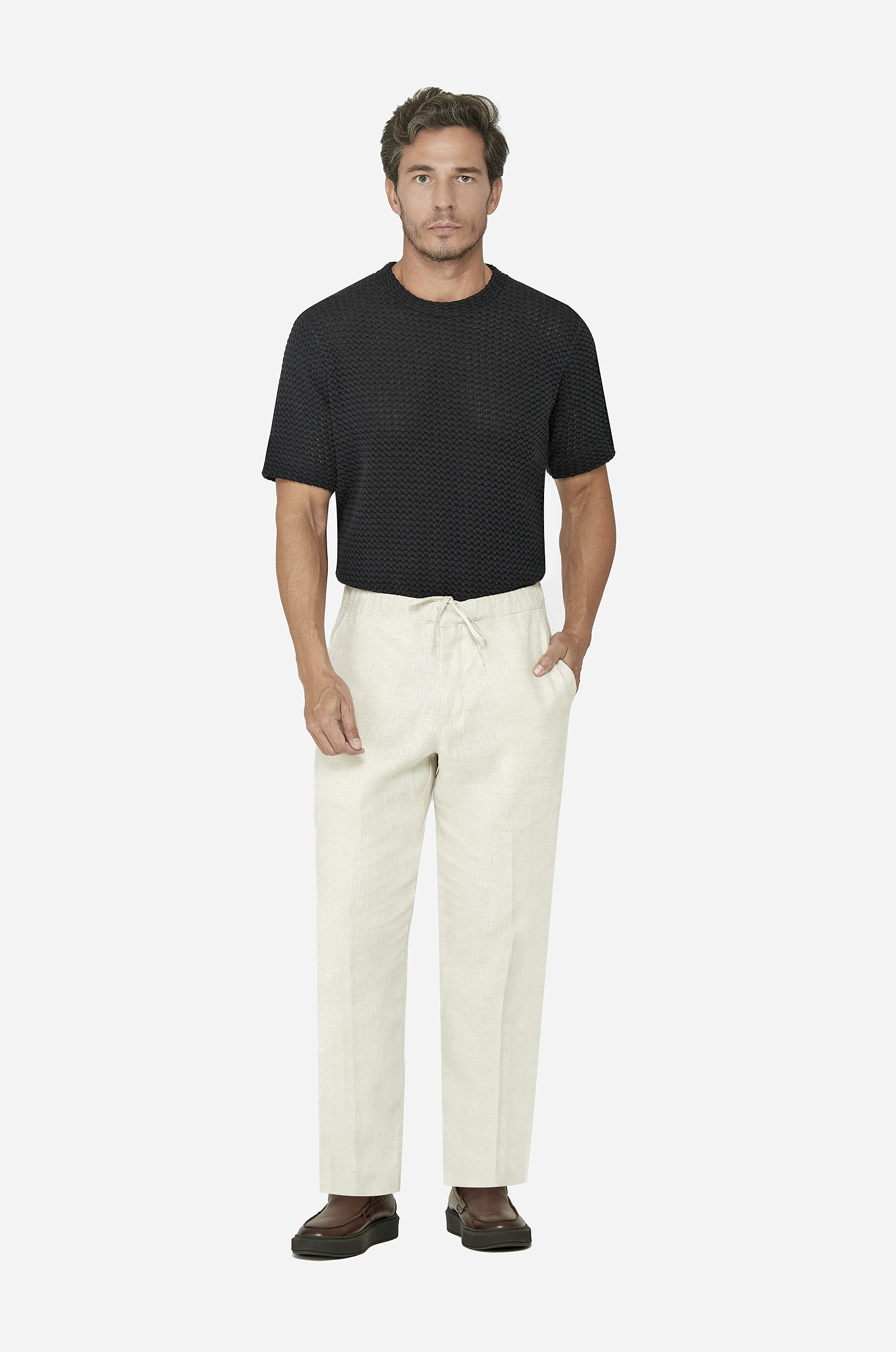 A calça de linho 100% representa a elegância contemporânea em sua essência, combinando refinamento estético com praticidade. Seu design minimalista apresenta um cós com elástico invisível, eliminando a necessidade de cinto e conferindo uma aparência discreta. Fabricada com materiais premium adequados ao clima tropical, assegura conforto e frescor. Sua gramatura pesada a torna versátil, sendo uma escolha ideal tanto para o verão quanto para temperaturas amenas.