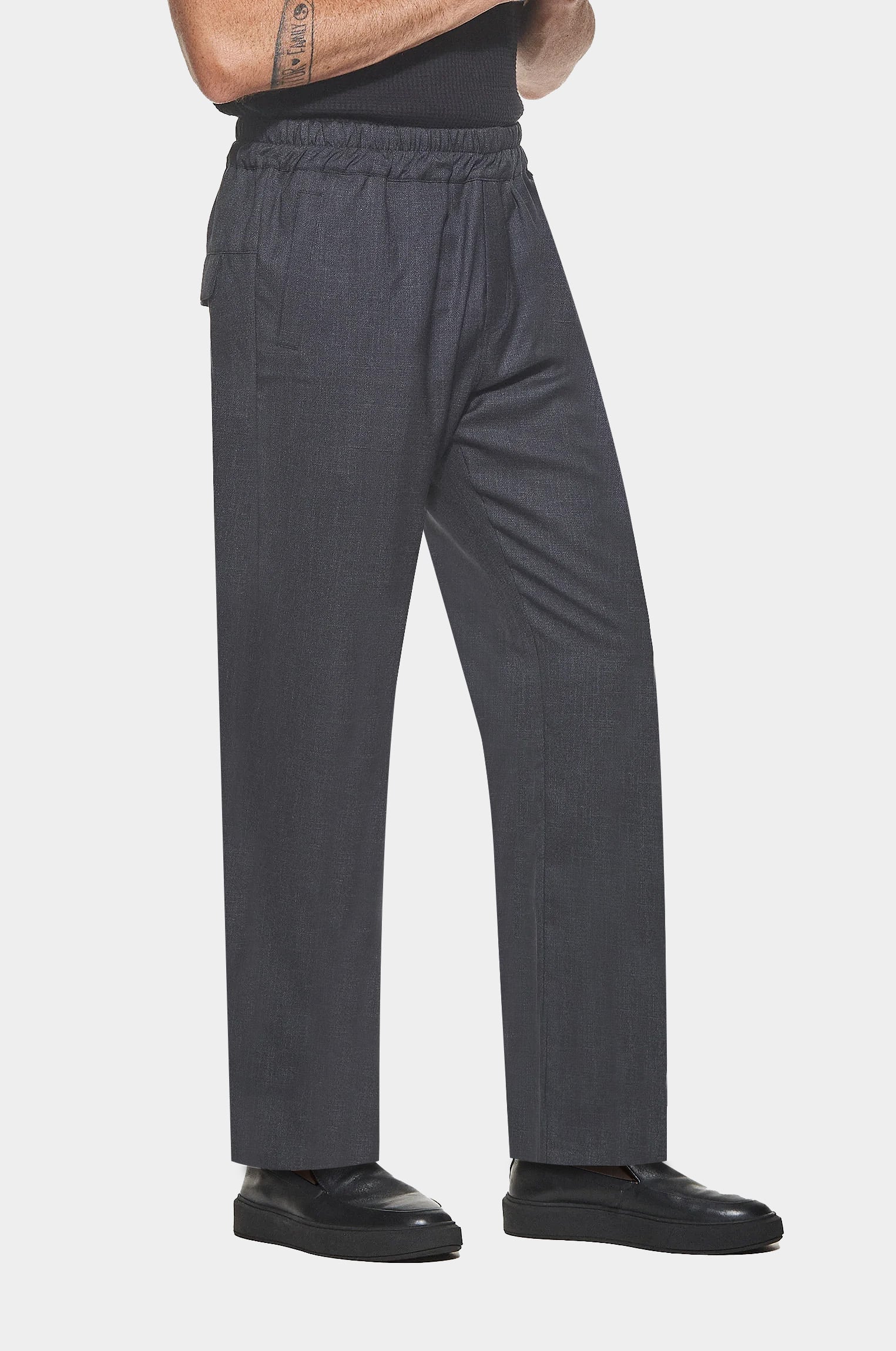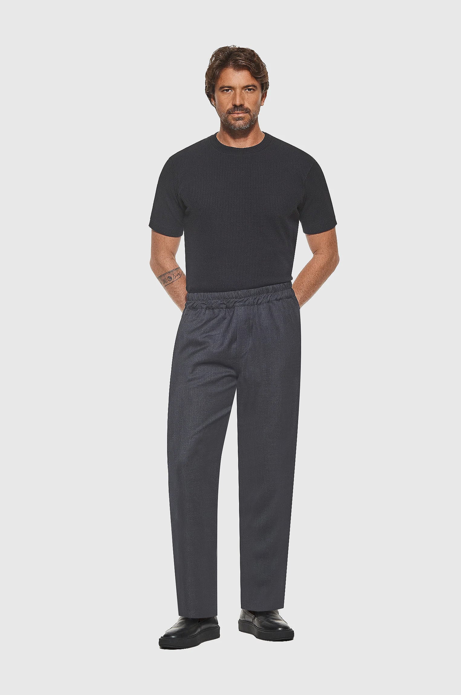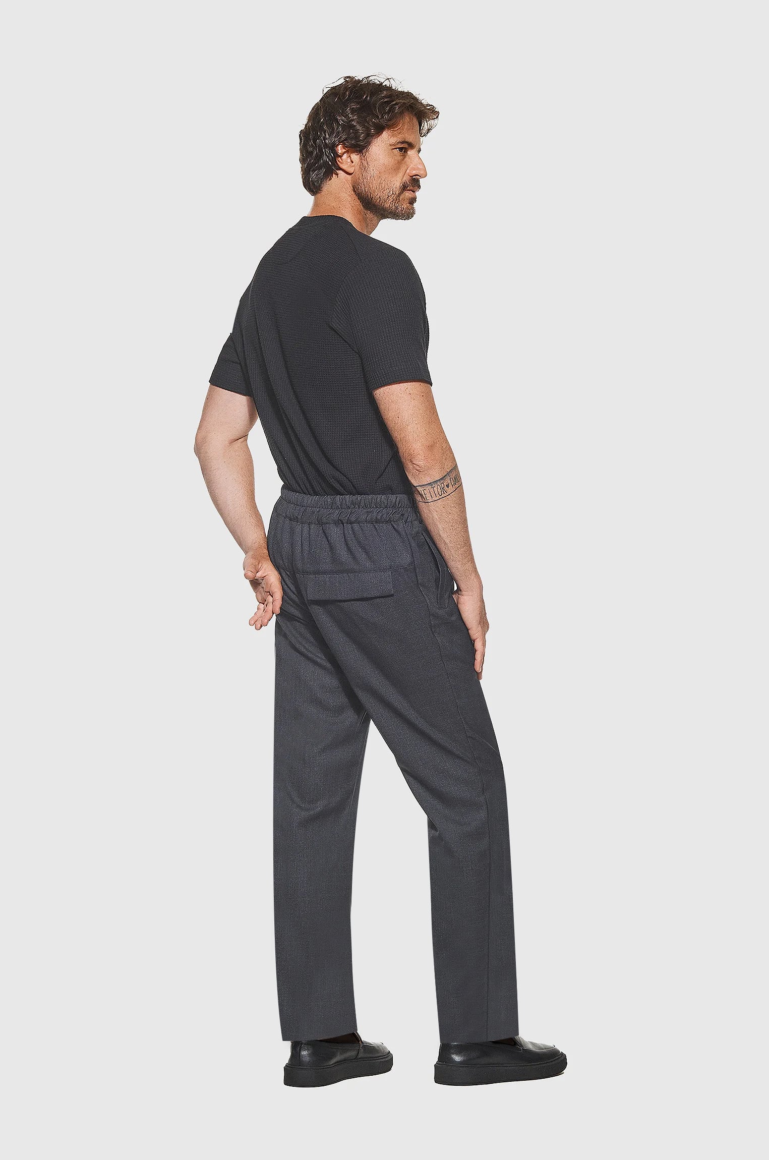 Combinando calças de alfaiataria clássica com elementos esportivos, como cós em elástico, proporções afastadas do corpo e cadarços, a Calça Alfaiataria Padrão reflete a harmonia entre a elegância e o conforto, essenciais para os dias atuais.