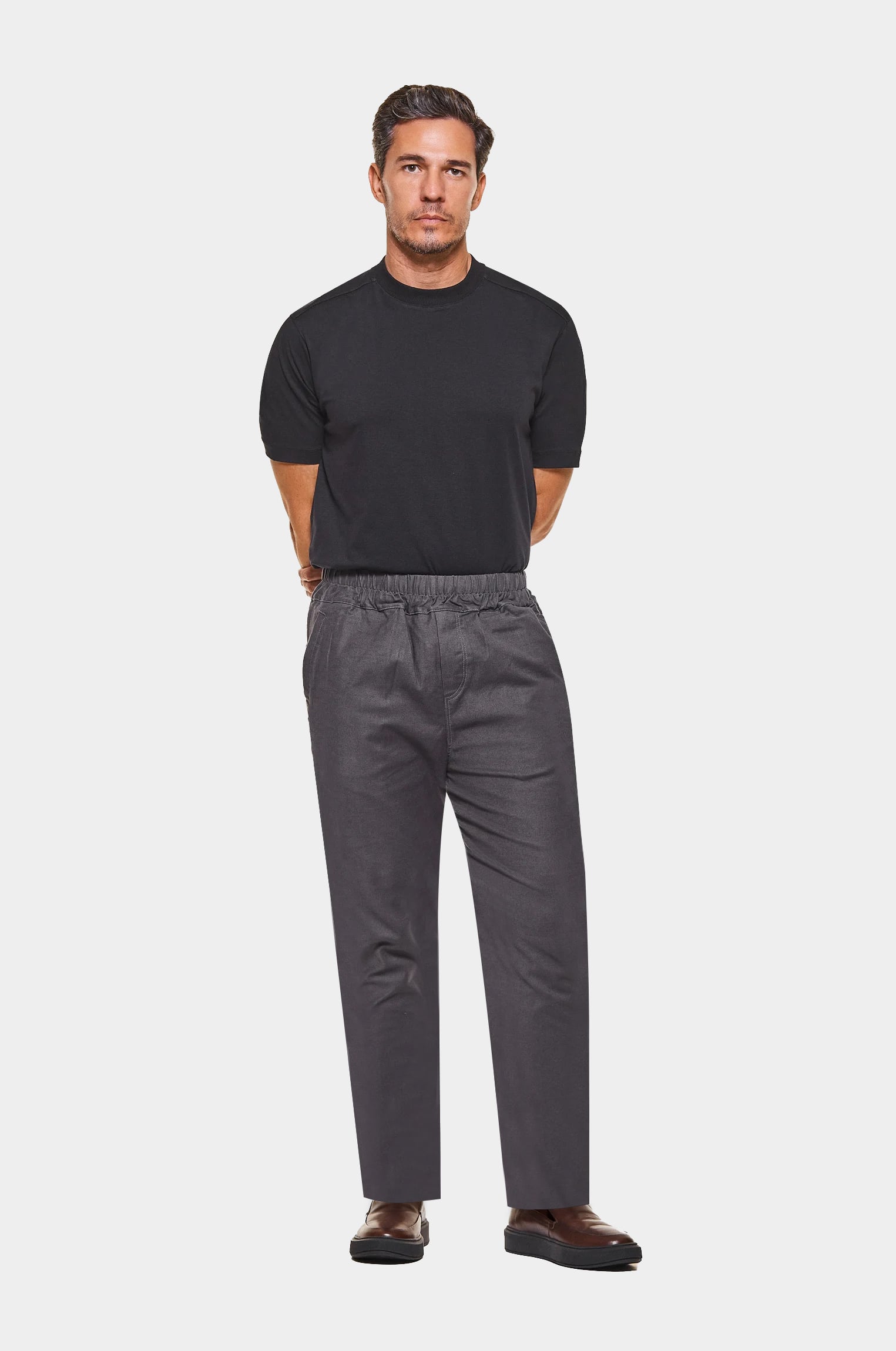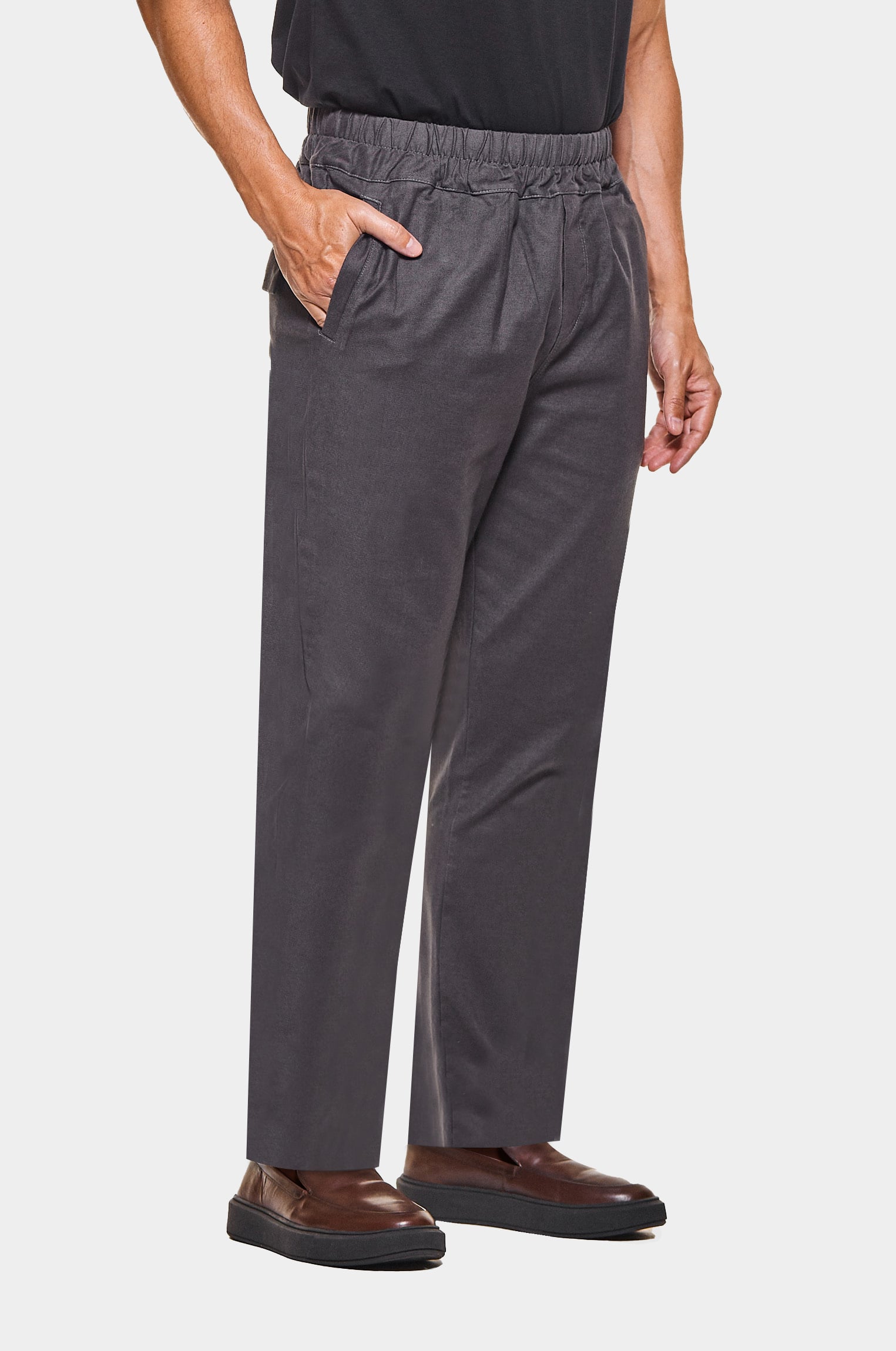 Inspirada nas calças esportivas de moletom com cós em elástico, este produto possui elementos de alfaiataria combinados ao estilo esportivo, como bolsos embutidos frontais e barra italiana.