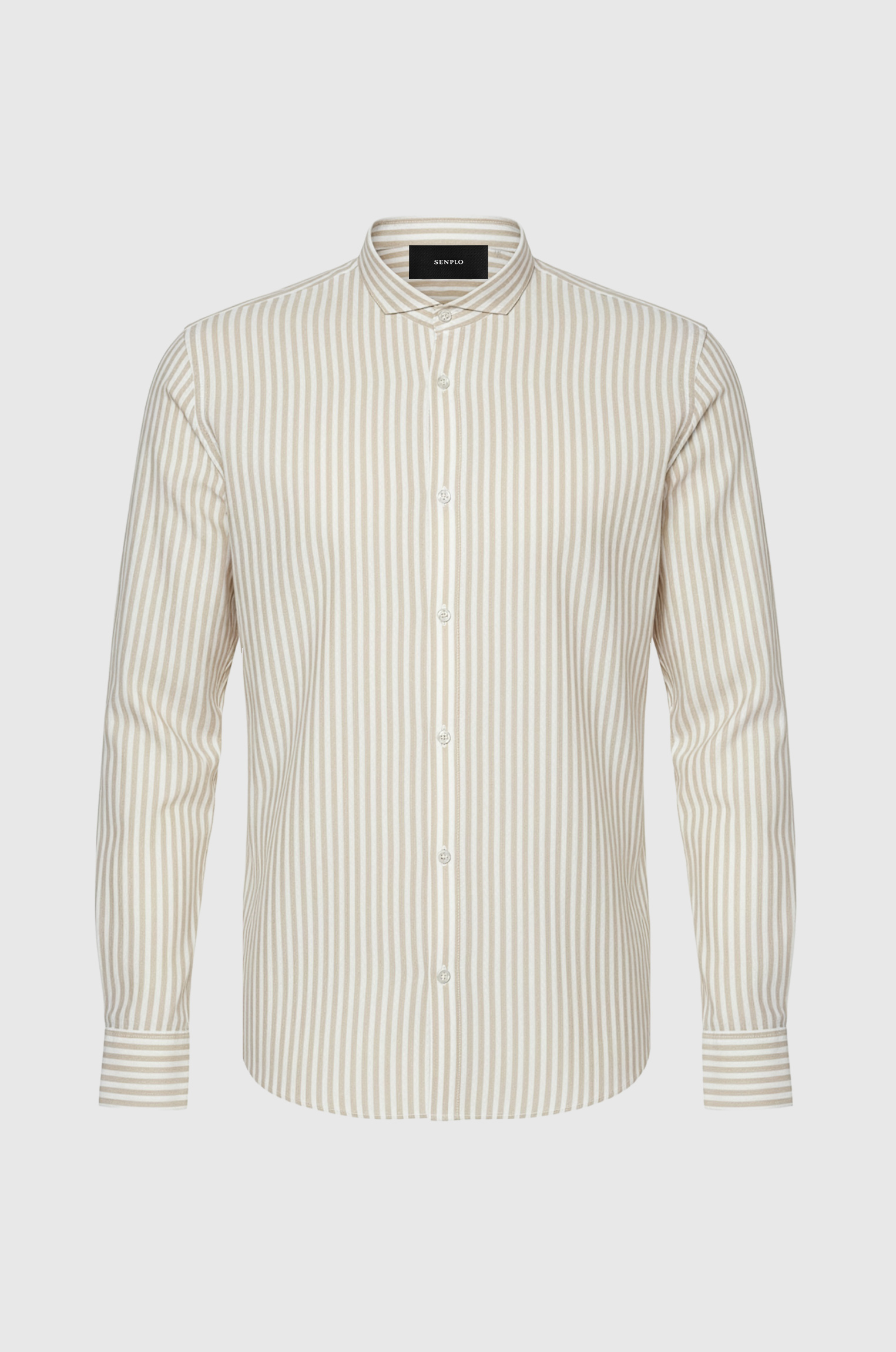 Inspirados pelo mundo clássico das camisas listradas, nós criamos a camisa gola garbo listrada bege.