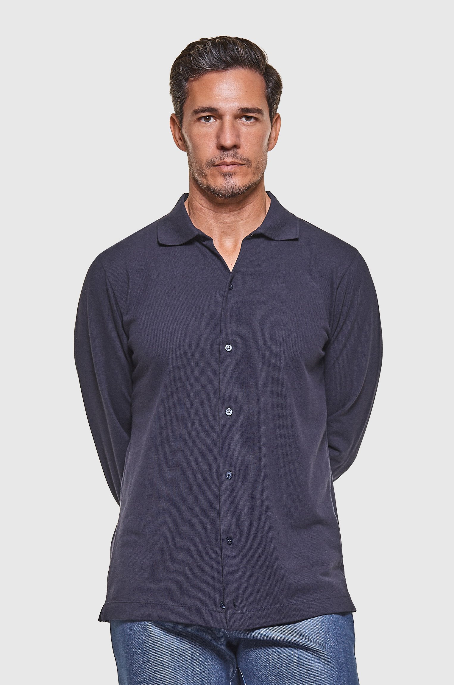 • Punhos virados sem botões estilo manga longa.